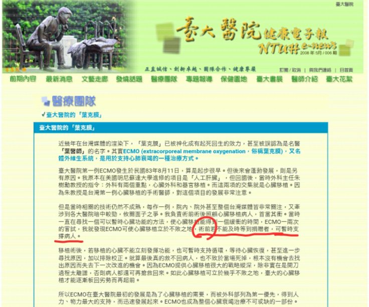 內文:我負責術前術後照顧心臟移植病人,首當其衝。當時一直在尋找一個可以暫時心臟功能的方法,使心臟移植能得到一個緩衝的時間,ECMO一兩次的嘗試,我就發現ECMO可使心臟移植立於不敗之地,術前若不能及時等到捐贈者,可暫時支撐病人。