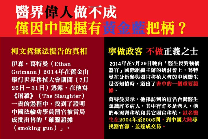 如依2014提告質疑「透過不敢具名的人在網路上散布妨礙柯文哲名譽的文章」,如今民視「政經看民視」節目及三立「新台灣加油」節目均公開指出「柯文哲確知中國所有器官來自法輪功」,也公開指出:柯文哲自稱是台商,去中國賣葉克膜影片,「屠殺」作者葛特曼也在三立節目視訊連線時公開說:「我想不到我不願意來做證的原因」。