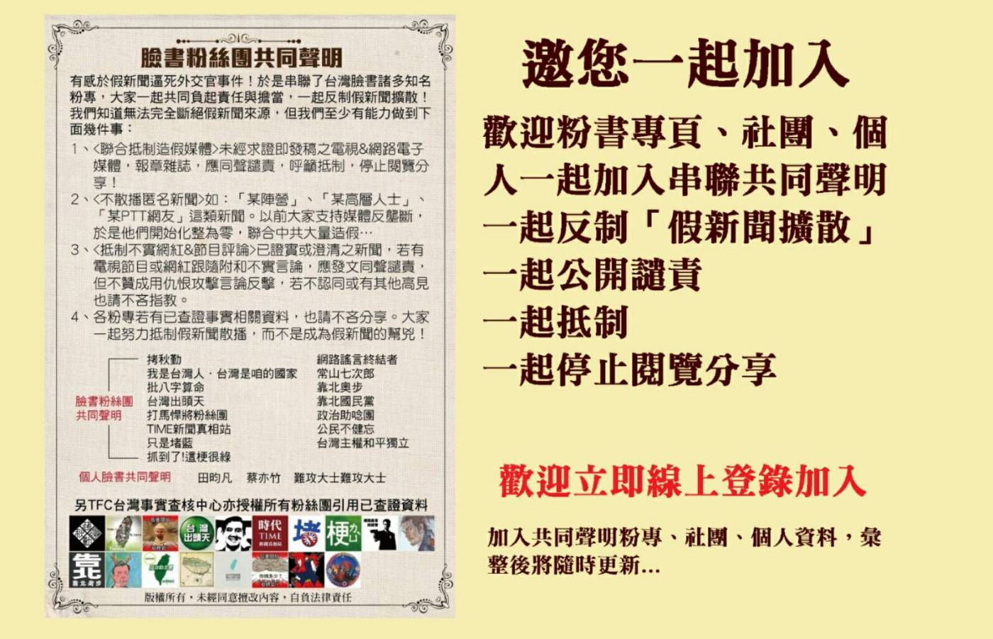 立即加入「臉書(粉絲專頁、社團、個人)反制假新聞共同聲明」