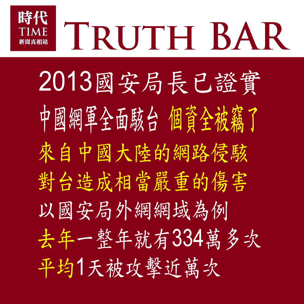 2013國安局長證實,來自中國大陸的網路侵駭,對台造成相當嚴重的傷害。以國安局外網網域為例,去年一整年就有334萬多次、平均1天被攻擊近萬次。他更語出驚人地說:「我們的個資可能都已經被竊了!」形成安內未果,又無法攘外的窘境。