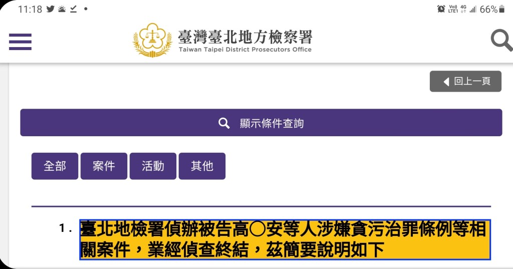 臺北地檢署偵辦被告高○安等人涉嫌貪污治罪條例等相關案件,業經偵查終結,茲簡要說明如下: